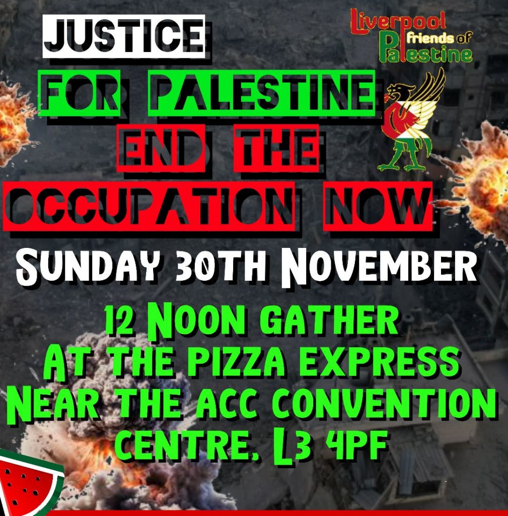 Saturday 29th, 12 noon – Southport Friends of Palestine regular one-hour vigil at the Atkinson Theatre on Southport’s Lord Street. Bring banners and flags!