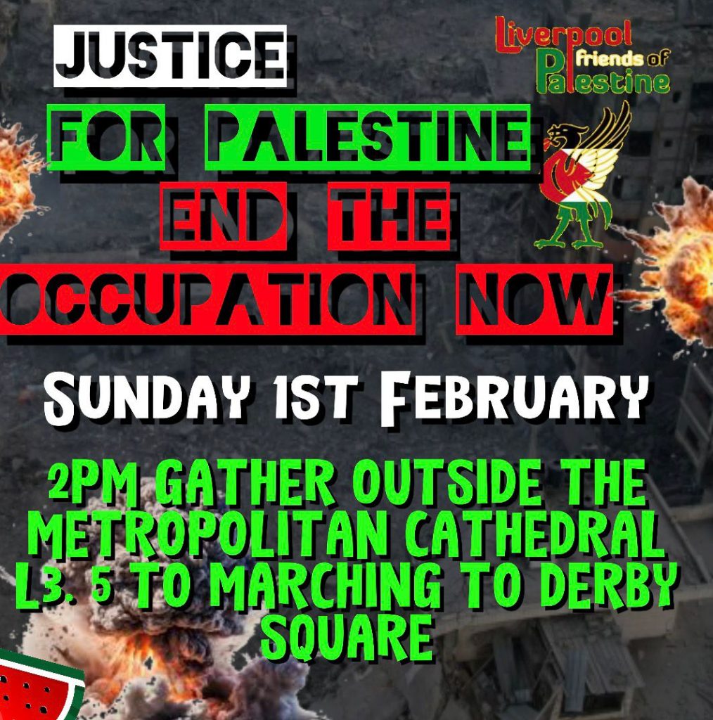 Sunday 1st, 2pm – our next march for the Palestinians starts from the Catholic Cathedral and proceeds to hear speakers at Derby Square. Bring banners and flags!