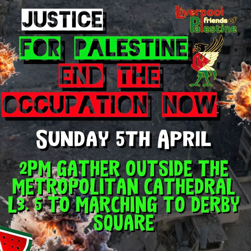 Sunday 5th, 2pm – our next march for the Palestinians starts from the Catholic Cathedral and proceeds to hear speakers at Derby Square. Bring banners and flags!