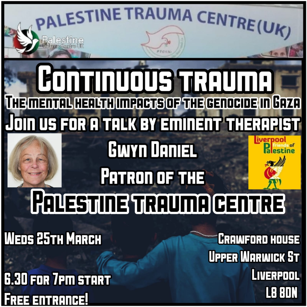 Wednesday 25th, 6.30pm – we are holding a public meeting on Trauma and collective ‘sumud’ (steadfastness) in a time of genocide, hosting Gwyn Daniel, an eminsnt psychotherapist and member of the UK-Palestine Mental Health Network The meeting will be at the Crawford Centre on Upper Warwick Street L8 3DN (use the Gwent Street entrance). All welcome.