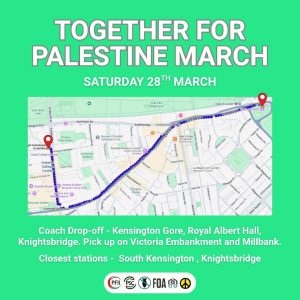 Saturday 28th, 12 noon – national demonstration for Palestine feeds into a national demonstration against the far right. Assemble at the Hyde Park end of Exhibition Road to join the feeder.