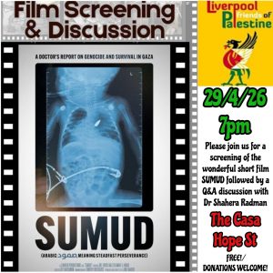 Wednesday 29th, 7pm – public screening of the film Sumud: a doctor’s report on genocide and survival in Gaza, we are joined by Dr Shahera Radman. The screening will be at the Casa bar on Hope Street, free admission (donations welcome)